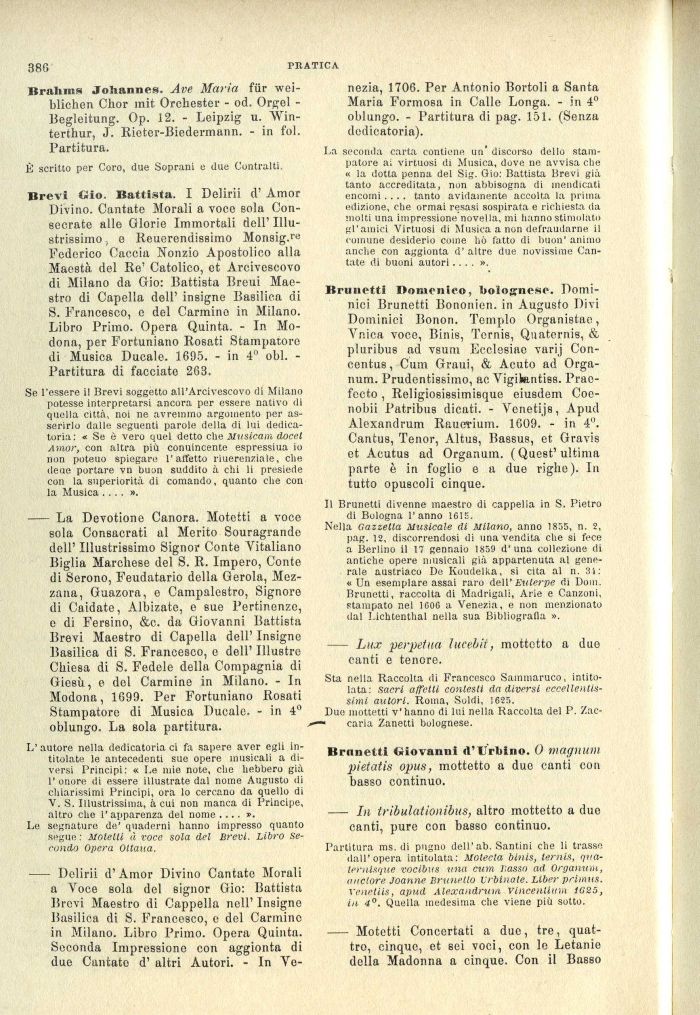 Brevi Gio. Battista. I Delirii d' Amor Divino. Cantate Morali a voce sola Consecrate alle Glorie Immortali dell' Illustrissimo , e Reuerendissimo Monsig.re Federico Caccia Nonzio Apostolico alla Maestà del Re' Catolico, et Arcivescovo di Milano da Gio: Battista Breui Maestro di Capella dell' insigne Basilica di S. Francesco, e del Carmino in Milano. Libro Primo. Opera Quinta. - In Mo-dona, per Fortuniano Rosati Stampatore di Musica Ducale. 1695. - in 4° obi. -Partitura di facciate 263.