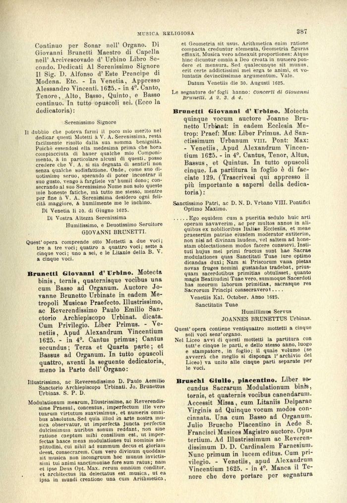 Brunetti Giovanni d'Urbino. Motecta binis, ternis, quaternisque vocibus una cum Basso ad Organum. Auctore Jo-vanne Brunetto Urbinate in eadem Metropoli Musicae Praefecto. Illustrissimo, ac Reverendissimo Paulo Emilio San-ctorio Archiepiscopo Urbinat. dicata. Cum Privilegio. Liber Primus. - Venetiis , Apud Alexandrum Vincentium 1625. - in 4°. Cantus primus; Cantus secundus ; Terza et Quarta parte ; et Bassus ad Organum. In tutto opuscoli quattro, aventi la seguente dedicatoria, meno la Parte dell'Organo: