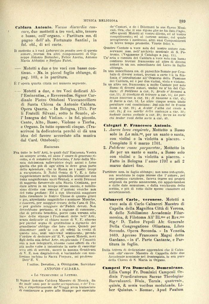 — Motetti a due, e tre Voci dedicati All' Eminentiss., e lleverendiss. Signor Cardinale Pietro Ottoboni Vicecancelliero di Santa Chiesa da Antonio Caldara. Opera Quarta. - In lìologna, 1715. Per li Fratelli Silvani, sotto le Scuole, all' Insegna del Violino. - in fol. piccolo. Canto, Alto, Basso, Violone o Tiorba, e Organo. In tutto opuscoli cinque. (Tra-scrivesi la dedicatoria perchè ci dà una idea del favore accordato alla musica dal Card. Ottoboni) :