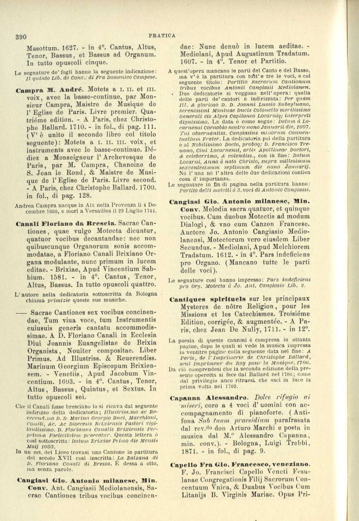 Cangiasi («io. Antonio milanese, Min. Conv. Melodia sacra quatuor, et quinque vocibus. Cum duobus Motectis ad modum Dialogi, & vno cum Canzon Francese. Auctore Jo. Antonio Cangiasio Menio-lanensi, Motectorum vero eiusdem Liber Secundus. - Mediolani, Apud Melchiorem Tradatum. 1612. - in 4°. Pars indeficiens prò Organo. (Mancano tutte le parti delle voci).