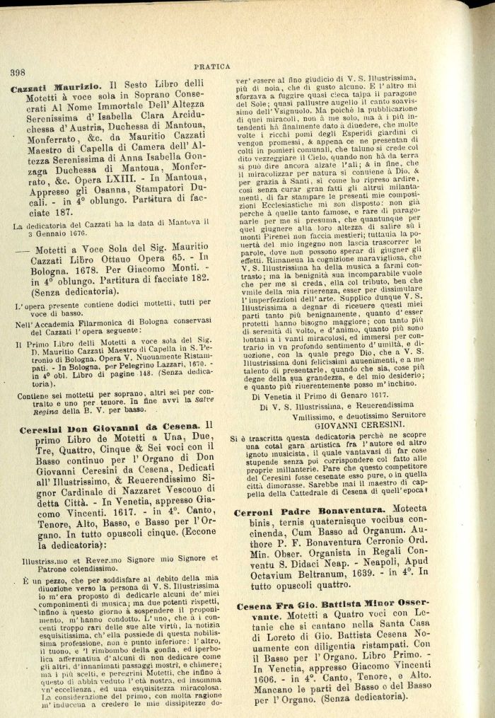 primo Libro de Motetti a Una, Due, Tre, Quattro, Cinque & Sei voci con il Basso continuo per 1' Organo di Don Giovanni Ceresini da Cesena, Dedicati all' Illustrissimo, & Reuerendissimo Signor Cardinale di Nazzaret Yescouo di detta Città. - In Venetia, appresso Giacomo Vincenti. 1617. - in 4°. Canto, Tenore, Alto, Basso, e Basso per l'Organo. In tutto opuscoli cinque. (Eccone la dedicatoria):