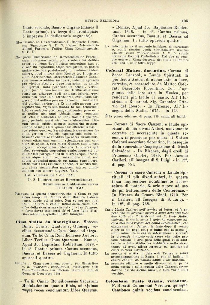 Cima Tullio da Ronciglione. Motecta Binis, Ternis, Quaternis, Quinisq; vocibus decantanda. Cum Basso ad Organum. Tullio Cima Roncilionense Auctore. Liber Tertius. Opus Quartum. - Romae, Apud Jo. Baptistam Roblettum. 1(329. -in 4°. Cantus primus, Cantus secundus, Bassus, et Bassus ad Organum. In tutto opuscoli quattro.