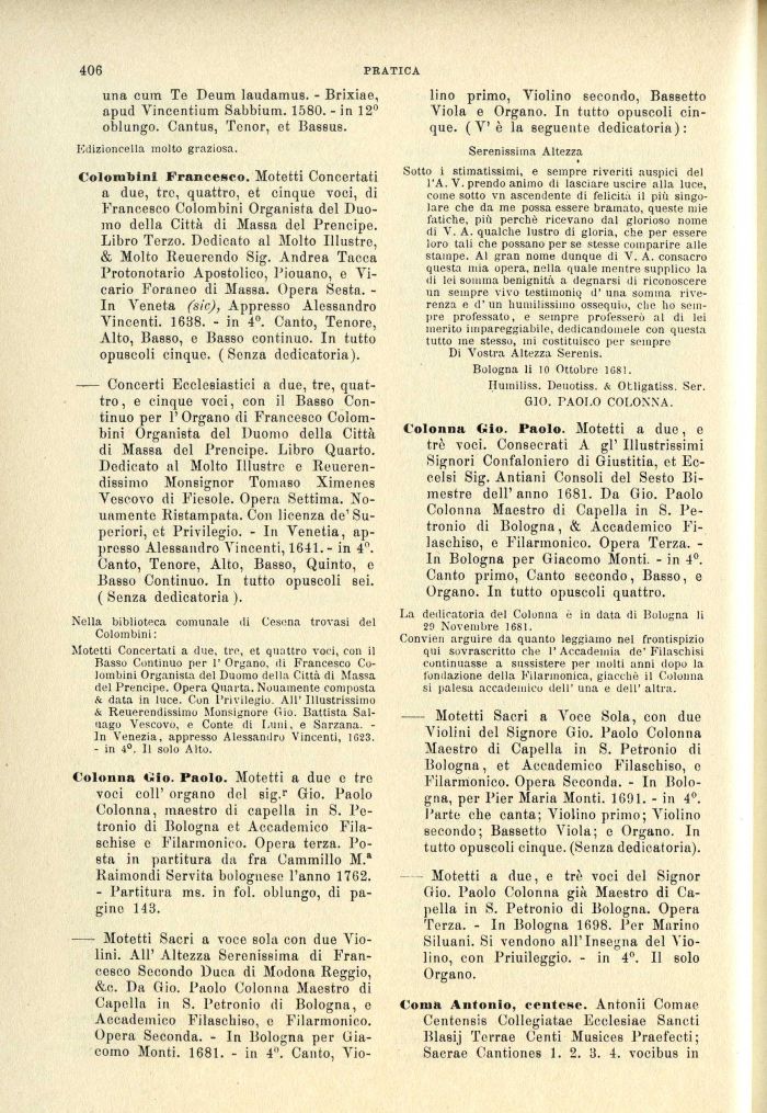 Colonna Gio. Paolo. Motetti a due, e tré voci. Consecrati A gì' Illustrissimi Signori Confaloniero di Giustitia, et Eccelsi Sig. Antiani Consoli del Sesto Bimestre dell'anno 1681. Da Gio. Paolo Colonna Maestro di Capella in S. Petronio di Bologna, & Accademico Filaschiso, e Filarmonico. Opera Terza. -In Bologna per Giacomo Monti. - in 4°. Canto primo, Canto secondo, Basso, e Organo. In tutto opuscoli quattro.