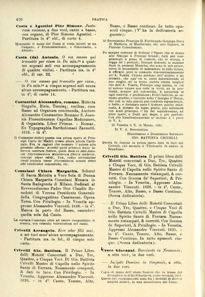 Crivelli «io. Battista. Il primo libro delli Motetti concertati a Due, Tre, Quattro e Cinque Voci, di Gio. Battista Crivelli Mastro di Capella nello Spirito Santo di Ferrara. Nuouamente ristampati, & corretti. Con licenza de' Superiori, & Priuilegio. - In Venetia, Appresso Alessandro Vincenti. 1628. - in 4°. Canto, Tenore, Alto, Basso, e Basso Continuo. (Senza dedicatoria).