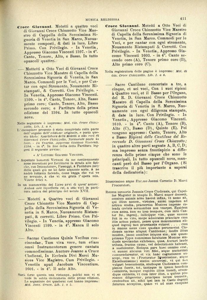 cinque, et sei voci, Con i suoi ripieni à Quattro voci, et il Basso per l'Organo, del R. I). Giovanni Croce Chiozzotto Maestro di Capella della Serenissima Signoria di Venetia in S. Marco, Nuo-uamente con ogni diligenza stampate, & date in luce. Con Privilegio. - In Venetia, Appresso Giacomo Vincenti. 1610. - in 4'. Canto (A), Tenore (B), Alto (C), Basso (D), Quinto (E). Poi vengono appresso : Canto, Tenore, Alto e Basso Ripieni delle Cantilene del Reverendo D. Giouanni Croce Chiozzotto ; in quattro altre parti segnate A, B, C, D; ma impresso senza frontispizio a differenza delle prime cinque che sono le principali. In tutto opuscoli nove, mancanti però del Basso per l'Organo. (Si trascrive il più importante a sapersi della dedicatoria):