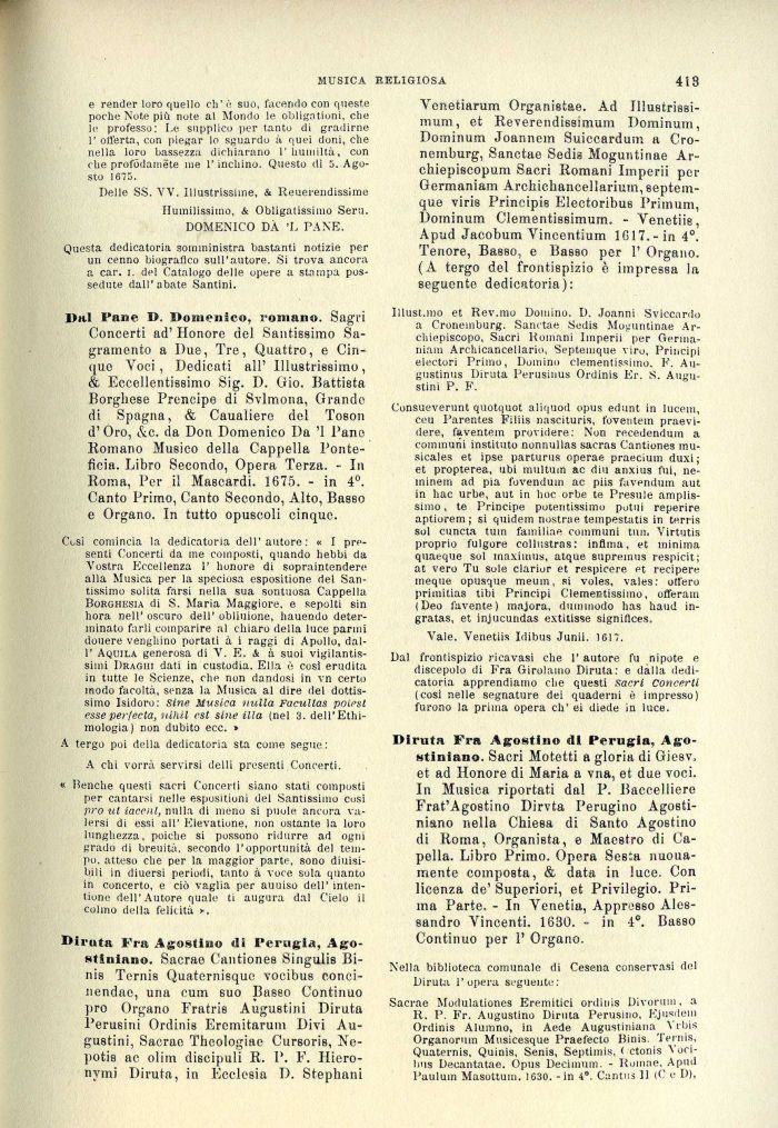 l>al Pane I>. Domenico, romano. Sagri Concerti ad' Honore del Santissimo Sa-gramento a Due, Tre, Quattro, e Cinque Yoci, Dedicati all' Illustrissimo, & Eccellentissimo Sig. D. Gio. Battista Borghese Prencipe di Svlmona, Grande di Spagna, & Cauaìiere del Toson d' Oro, &e. da Don Domenico Da '1 Pane Romano Musico della Cappella Ponte-fìcia. Libro Secondo, Opera Terza. - In Roma, Per il Mascardi. 1675. - in 4°. Canto Primo, Canto Secondo, Alto, Basso e Organo. In tutto opuscoli cinque.