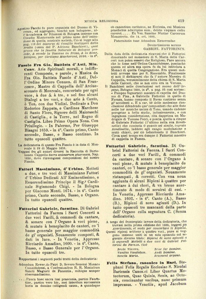 Fattorini Gabriele, faentino. Di Gabriel Fattorini da Faenza. I Sacri Concerti a due voci Facili, & commodi da cantare, & sonare con l'Organo à voci piene, & mutate à beneplacito de cantori, co '1 basso generale per maggior commodità de gì' organisti. Nouamente ristampati, & corretti. Con vna noua aggiunta di alcuni Ripieni à quattro per cantare à dui chori, & vn breue auer-timento & modo di seruirsi di essi. -In Venetia, Appresso Ricciardo Amadino. 1602. - in 4°. Canto (A.), Basso (B.), Ripieni di novo agiunti (D.). In tutto opuscoli tre mancanti della parte dell' Organo colla segnatura C. (Senza dedicatoria).