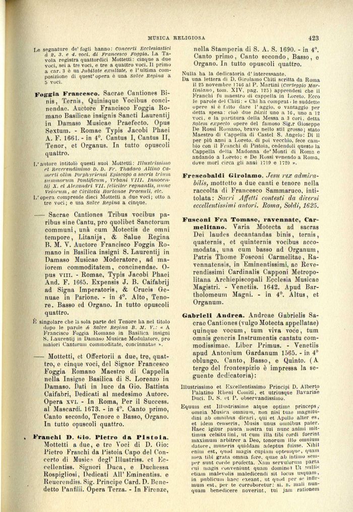 B. M. V. Auctore Francisco Foggia Romano in Basilica insigni S. Laurentij in Damaso Musicae Moderatore, ad ma-iorem commoditatem, concinendae. 0-pus vili. - Romae, Typis Jacobi Pbaei And. F. 1665. Expensis J. B. Caifabrij ad Signa Imperatoris, & Crucis Ge-nuae in Parione. - in 4°. Alto, Tenore. Basso ed Organo. In tutto opuscoli quattro.