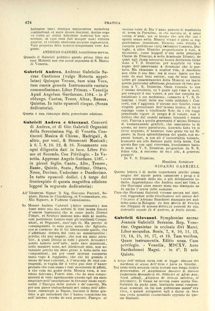 Gabrieli Andrea. Andreae Gabrielis Sacrae Cantiones (vulgo Motecta appel-latae) Quinque Vocum, tum uiua Voce, tum omnis generis Instruinentis cantatu commodissimae. Liber Primus. - Venetijs Apud Angelum Gardanum. 1584. - in 4° oblungo. Cantus, Tenor, Altus, Bassus, Quintus. In tutto opuscoli cinque. (Senza dedicatoria).