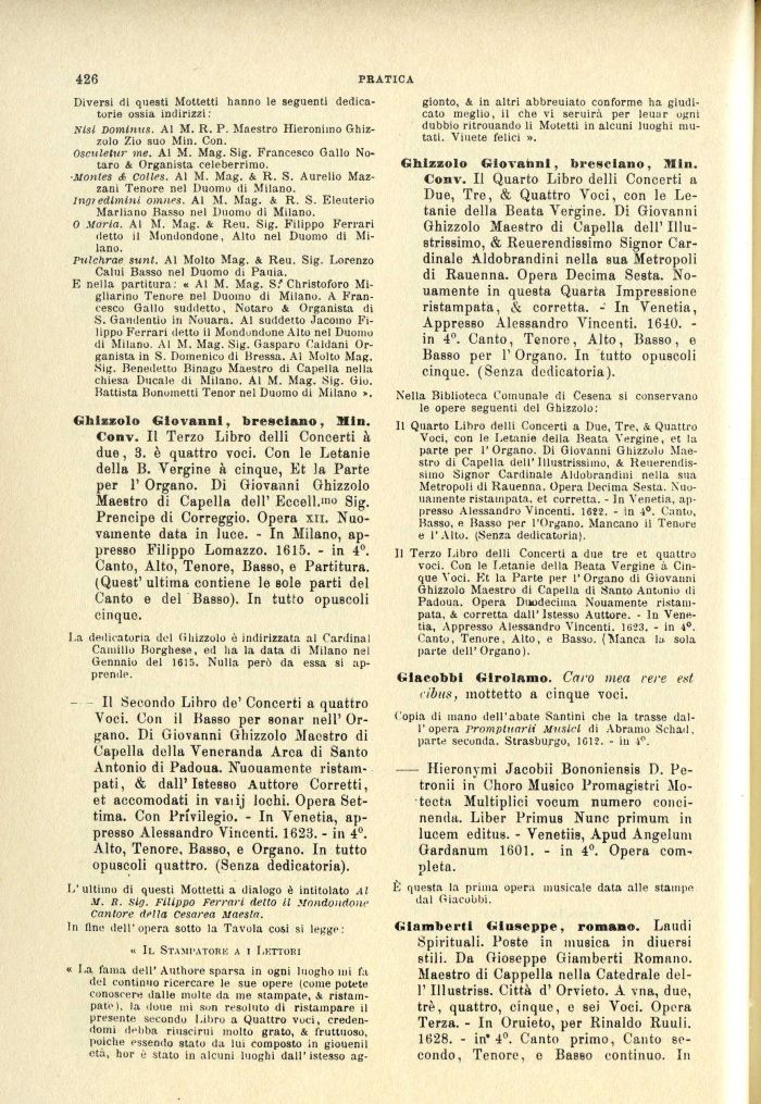 Ghizzolo Giovanni, bresciano, Min. Conv. Il Quarto Libro delli Concerti a Due, Tre, & Quattro Voci, con le Letanie della Beata Vergine. Di Giovanni Ghizzolo Maestro di Capella dell' Illustrissimo, & Reuerendissimo Signor Cardinale Aldobrandini nella sua Metropoli di Rauenna. Opera Decima Sesta. Nouamente in questa Quarta Impressione ristampata, & corretta. -' In Venetia, Appresso Alessandro Vincenti. 1640. -in 4°. Canto, Tenore, Alto, Basso, e Basso per 1' Organo. In tutto opuscoli cinque. (Senza dedicatoria).