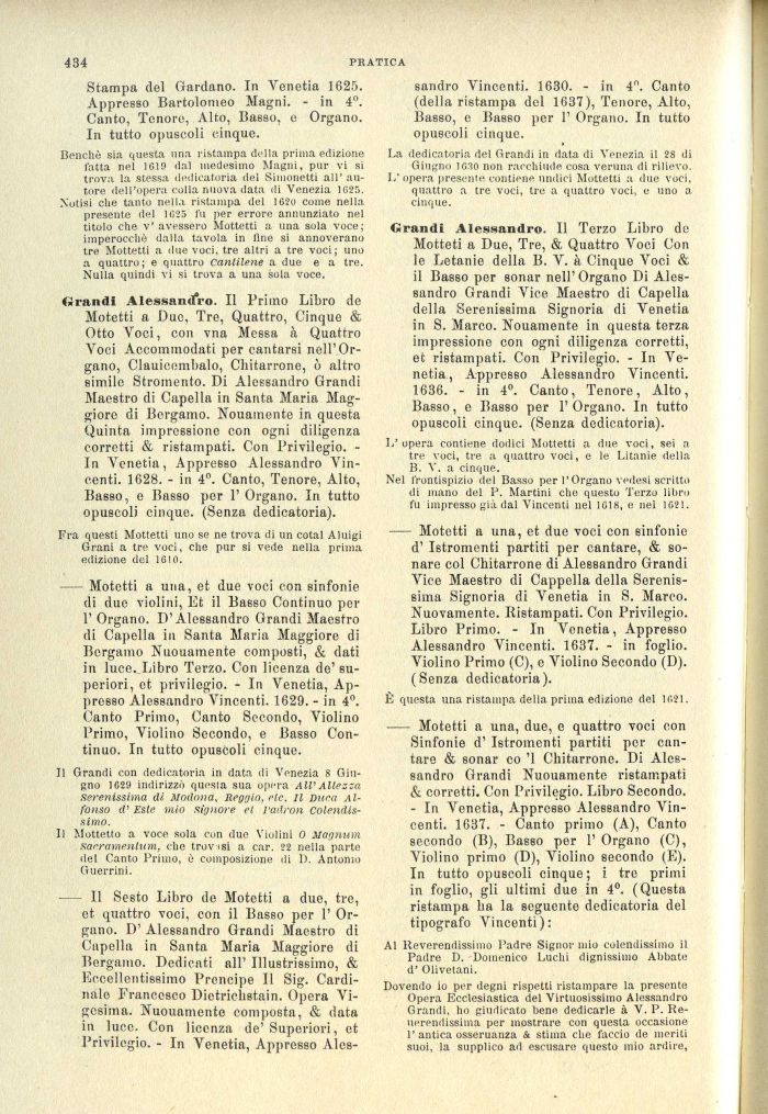 Sinfonie d' Istromenti partiti por cantare & sonar co '1 Chitarrone. Di Alessandro Grandi Nuouamente ristampati & corretti. Con Privilegio. Libro Secondo. - In Venetia, Appresso Alessandro Vincenti. 1637. - Canto primo (A), Canto secondo (B), Basso per 1' Organo (C), Violino primo (D), Violino secondo (E). In tutto opuscoli cinque ; i tre primi in foglio, gli ultimi due in 4°. (Questa ristampa ha la seguente dedicatoria del tipografo Vincenti):
