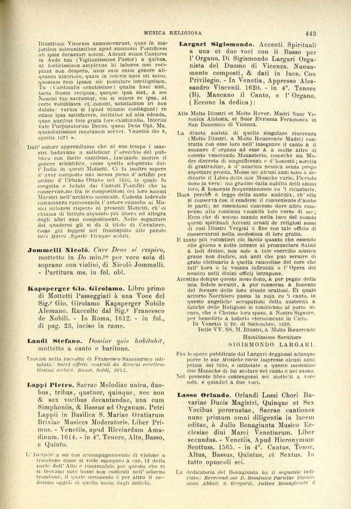 Fra le opere pubblicate dal Largari deggionsi adunque porre le sue Musiche varie impresse alcuni anni prima del 1020, e intitolate a queste medesime due Monache di lui scolare nel canto e nel suono.