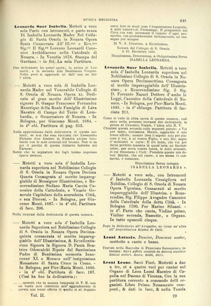 — Motetti a voce sola di Isabella Leonarda Madre nel Venerabile Collegio di S. Orsola di Nouara. Opera xi. Dedicata al gran merito dell' Illustrissimo signore D. Gaspar Francesco Fernandez Manrrique della Reale Famiglia di Lara Maestro di Campo del Terzo di Lombardia, e Gouernatore di Nouara. - In Bologna, per Giacomo Monti. 1684. -in 4° obi. Partitura di pag. 252.