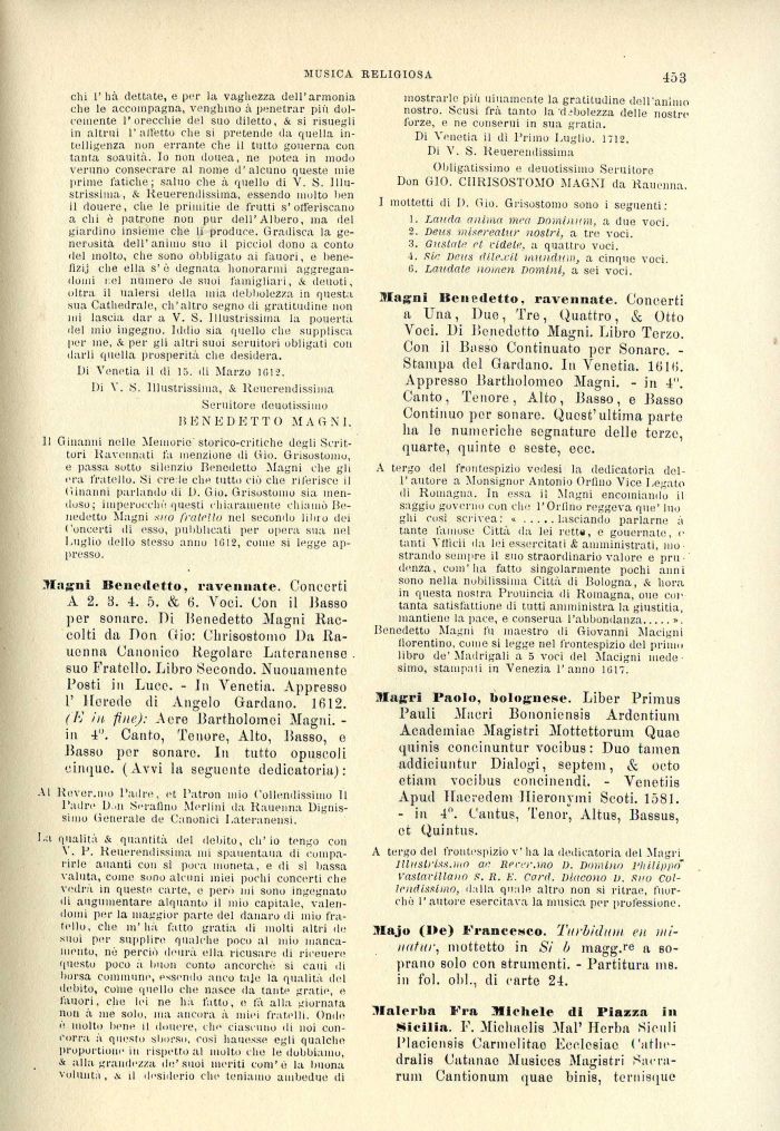 Magni Benedetto, ravennate. Concerti A 2. 3. 4. 5. & 6. Voci. Con il Basso per sonare. Di Benedetto Magni Raccolti da Don (Jio: Clirisostomo Da Ha-uenna Canonico Regolare Lateranense . suo Fratello. Libro Secondo. Nuouamente Posti in Luce. - In Venetia. Appresso 1' 1 [erodo di Angelo Gardano. 1612. (Fj in fine): Aere Bartholomei Magni. -in 4°. Canto, Tenore, Alto, Basso, e Basso per sonare. Iti tutto opuscoli cinque. (Avvi la seguente dedicatoria):