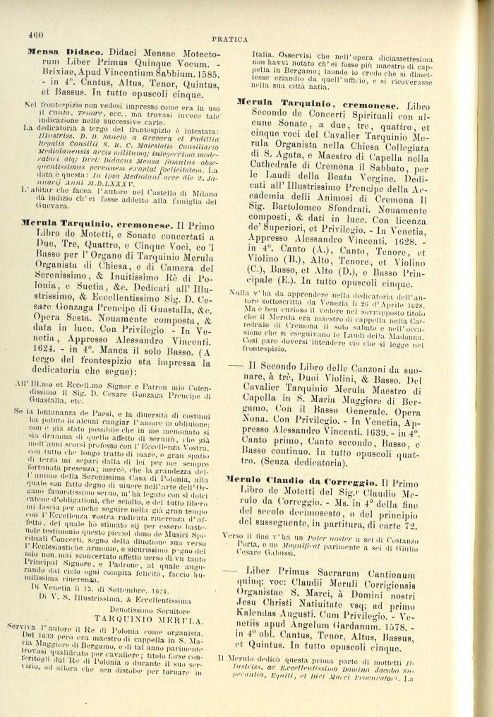 Merlila Tarquinio, cremonese. Il Primo Libro do Motetti, e Sonato concertati a Due, Tre, Quattro, e Cinque Voci, co '1 Basso per 1' Organo di Tarquinio Menila Organista di Chiesa, e di Camera del Serenissimo, & Inultissimo ltè di Polonia, e Suetia, &c. Dedicati all'Illustrissimo, & Eccellentissimo Sig. D. Cosare Gonzaga Prencipe di Guastalla, ite. Opera Sesta. Nouamente composta, & data in luce. Con Privilegio - In Venetia , Appresso Alessandro Vincenti. 1 (524. - in 4'. Manca il solo Basso. (A tergo del frontespizio sta impressa la dedicatoria che segue):