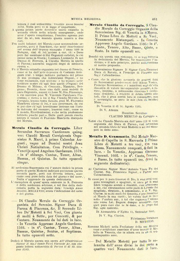 Notisi che Claudio Merulo sin dall'anno si vede organista del Duca di Parma, così tonandosi nel secondo libro de'suoi Mottetti a sei oci stampati in detto anno.