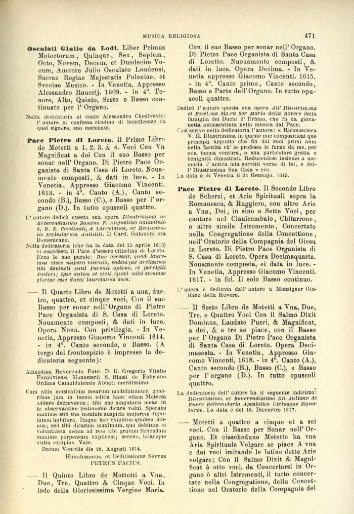 Pace Pietro di Loreto. Il Primo Libro de Motetti a 1. 2. 3. & 4. Voci Con Vn Magnificat a doi Con il suo Basso per sonar nell' Organo. Di Pietro Pace Organista di Santa Casa di Loreto. Nouamente composti, & dati in luce. - In Venetia, Appresso Giacomo Vincenti. 1613. - in 4°. Canto (A.), Canto secondo (B.), Basso (C.), e Basso per 1' organo (D.). In tutto opuscoli quattro.