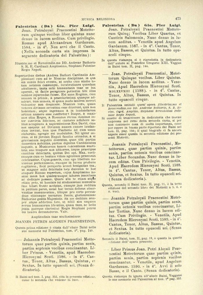 Joan. Petraloysii Praenestini Motetto-rum quinque vocibus liber quintus nunc tlenuo in lucem aeditus. Cum privilegio. Romae apud Alexandrum Gardunum. 1584. - in 4°. Non avvi che il Canto. (Nella seconda carta sta impressa la seguente dedicatoria del Palestrina):