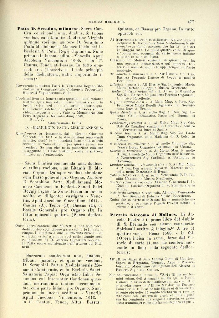 Patta J>. Serafino, milanese. Sacra Cantica colici notula una, duubus, & tribus vocibus, cum Lituniis li. Mariae Virginis quinquo vocibus, auctore D. Sernphino l'atta Mcdiolnnensi Monaco Casincnsi in Ecclesia S. l'etri Hegij Organista. Nunc primum in lucem aedita. - Venetiis, Apud Jacobum Vincentium 1(100. - in 4°. Cantus, Tenor, et lìassus. In tutto opuscoli tre. (Trascrivesi il solo principio della dedicatoria, nulla importando il resto) :