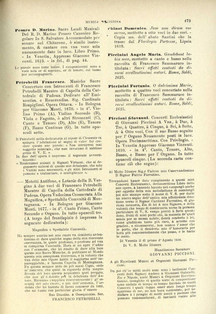 Piccioni Giovanni. Concerti Ecclesiastici di Giovanni Piccioni A Vna, à Due, à Tre, n Quattro, à Cinque, à Sei, à Sette, & a Otto voci, Con il suo Busso seguito per 1' Organo Nouamente posti in luce. Opera Decimasettima. Con Privilegio. -In Venetia Appresso Giacomo Vincenti. 1610. - in 4°. Canto, Tenore, Alto, Basso, e Basso per 1' Organo. In tutto opuscoli cinque. (La seconda carta contiene ciò che segue):