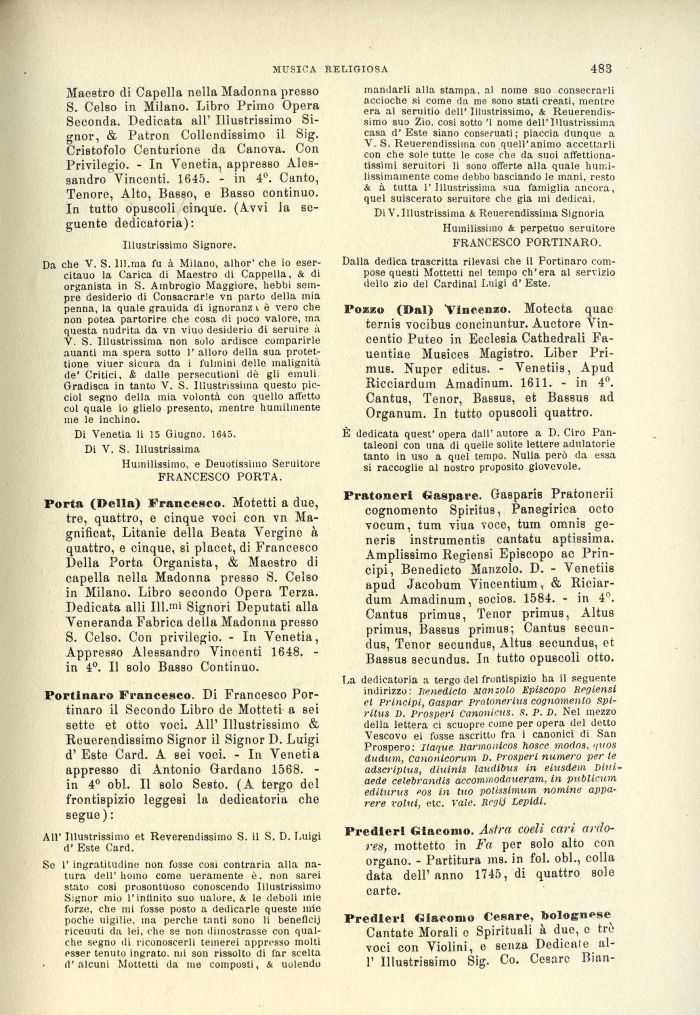 Dalla dedica trascritta rilevasi che il Portinaro compose questi Mottetti nel tempo ch'era al servizio dello zio del Cardinal Luigi d' Este.