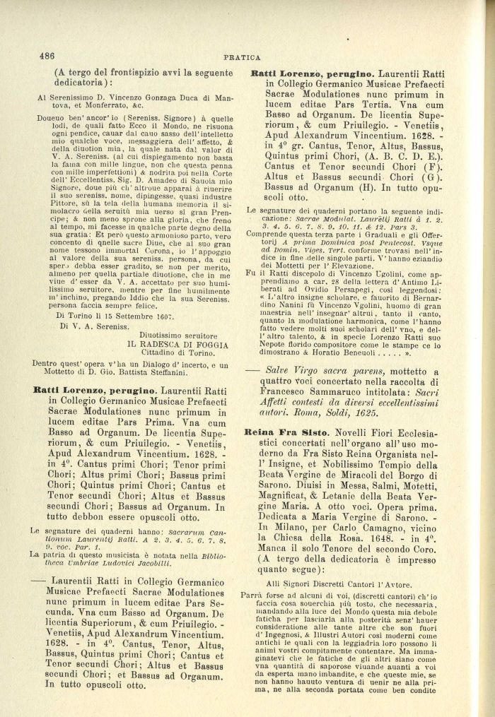 Ratti Lorenzo, perugino. Laurentii Ratti in Collegio Germanico Musicae Prefaecti Sacrae Modulationes nunc primum in lucem editae Pars Tertia. Vna cum Basso ad Organum. De licentia Superiorum , & cum Priuilegio. - Venetiis, Apud Alexandrum Vincentium. 1628. -in 4° gr. Cantus, Tenor, Altus, Bassus, Quintus primi Chori, (A. B. C. D. E.). Cantus et Tenor seeundi Chori (P). Altus et Bassus seeundi Chori (G). Bassus ad Organum (H). In tutto opuscoli otto.