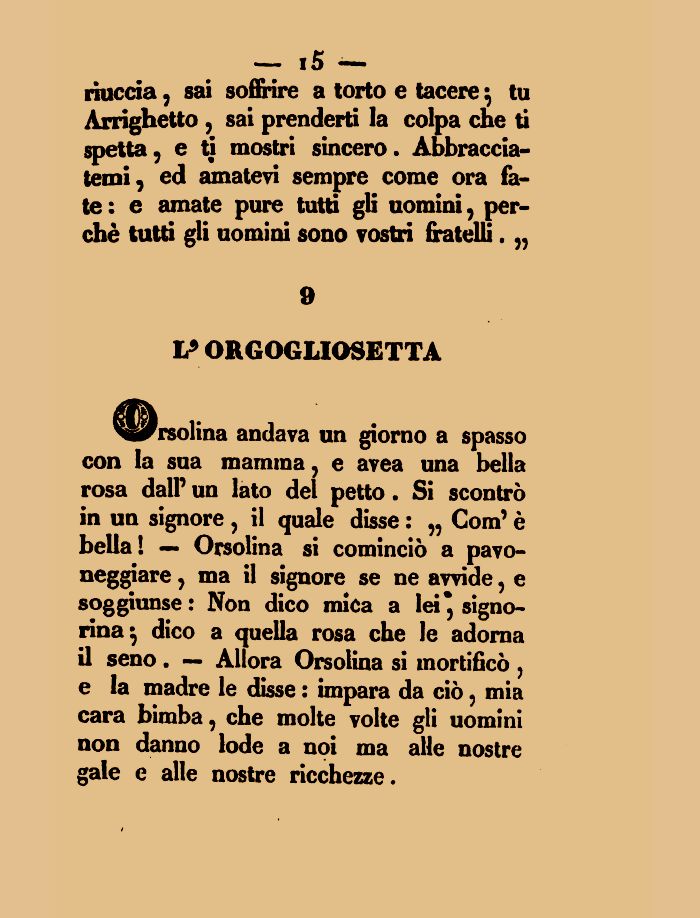 ^^rsolina andava un giorno a spasso con la sua mamma, e avea una bella rosa dalP un lato del petto. Si scontrò in un signore , il quale disse : ,, Com' è bella! — Orsolina si cominciò a pavo-neggiare, ma il signore se ne avvide, e soggiunse: Non dico mica a lei* signorina} dico a quella rosa che le adorna il seno. — Allora Orsolina si mortificò , e la madre le disse : impara da ciò, mia cara bimba, che molte volte gli uomini non danno lode a noi ma alle nostre gale e alle nostre ricchezze.