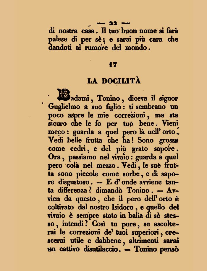 Jl^adami, Tonino, diceva il signor Guglielmo a suo figlio : ti sembrano un poco aspre le mie correzioni, ma sta sicuro che le fo per tuó bene.. Vieni meco : guarda a quel pero là nelP orto * Vedi belle frutta che ha! Sono grosse come cedri, e del più grato sapore. Ora, passiamo nel vivaio : guarda a quel pero colà nel mezzo. Vedi, le suè frutta sono piccole come sorbe, e di sapore disgustoso . — Ed' onde avviene tanta differenza ? dimandò Tonino. — Av-vien da questo, che il pero dell' orto è coltivato dal nostro Isidoro, e quello del vivaio è sempre stato in balìa di sè stesso , intendi ? Così tu pure, se ascolterai le correzioni de' tuoi superiori, crescerai utile e dabbene, altrimenti sarai un cattivo disutilaccio. — Tonino pensò
