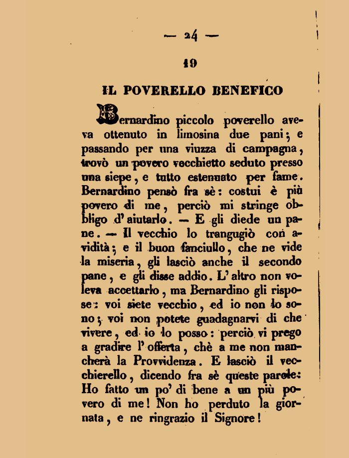 ^^ernardino piccolo poverello aveva ottenuto in limosina due pani-, e passando per una viuzza di campagna, trovò un povero vecchietto seduto presso una siepe, e tutto estenuato per fame. Bernardino pensò fra sè: costui è piò povero di me, perciò mi stringe obbligo d'aiutarlo. — E gli diede un pane . — Il vecchio lo trangugiò con an vidità ^ e il buon fanciullo, che ne vide la miseria, gli lasciò anche il secondo pane 1 e gli disse addio. L'altro non voleva accettarlo, ma Bernardino gli rispose; voi siete vecchio, ed io non lo sono^ voi non potete guadagnarvi di che vivere, ed io lo posso : perciò vi prego a gradire P offerta , chè a me non mancherà la Provvidenza. E lasciò il veo-chierello, dicendo fra sè queste parete* Ho fatto tm po' di bene a un più povero di me! Non ho perduto la giornata , e ne ringrazio il Signore !