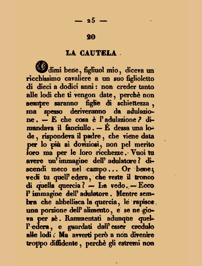 ^^dimi bene, figliuol mio, diceva un ricchissimo cavaliere a un suo figlioletto di dieci a dodici anni : non creder tanto alle lodi che ti vengon date , perchè non sempre saranno figlie di schiettezza , ma spesso deriveranno da adulazione. — E che cosa è l'adulazione? dimandava il fanciullo. — È dessa una lo^ de, rispondeva il padre, che viene data per lo più ai doviziosi, noti pel merito loro ma per le loro ricchezzeVuoi tu avere un' immagine dell' adulatore ? discendi meco nel campo... Or bene} vedi tu qoelP edera, che veste il tronco di quella quercia? — La vedo. — Ecco l'immagine dell' adulatore. Mentre sembra che abbellisca là quercia, le rapisce; una porzione dell' alimento , e se ne gioiva per $è. Rammentati adunque quell'edera, e guardati dall'esser credulo alle lodi ; Ma avverti però a non divenire troppo diffidente, perchè gli estremi non