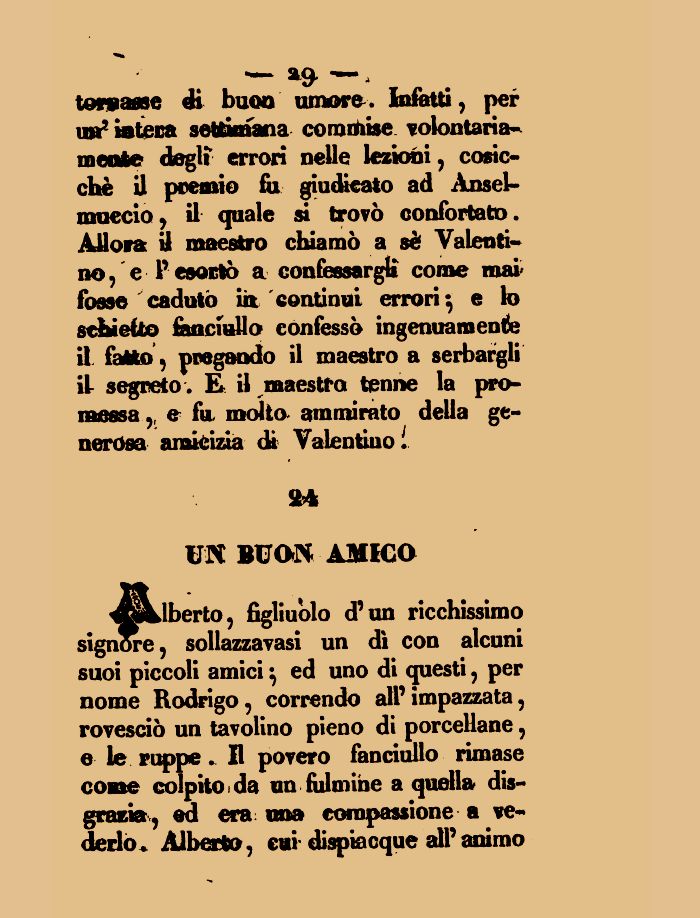 tornasse di buoo umore. Infetti , per u»3 mteca settimana commise volontari a-mente degli errori nelle lezioni, cosicché il premio fu giudicato ad Ànsel-muecio , il quale si trovò confortato . Allora: ii maestro chiamò a sè Valentino, e P esodò a confessargli come mai' fosse caduto ia continui errori-, e lo se&ietao fanciullo confessò ingenuamente il fatto, pregando il maestro a serbargli il- segreto. E* il maestro tenne la promessa ,, e fa molta ammirato della generosa amicizia di Valentino l