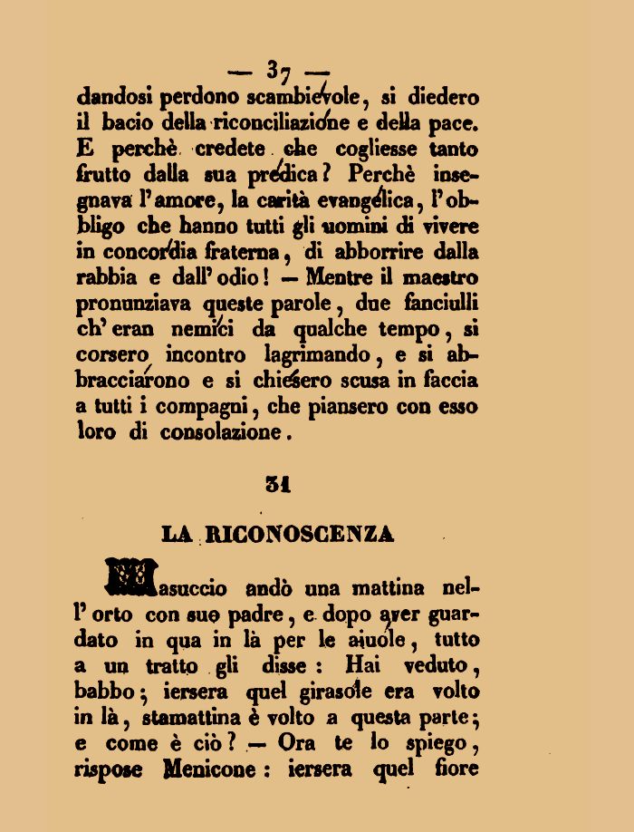 — 37 — dandosi perdono scambievole, si diedero il bacio della riconciliazióne e della pace. E perchè credete che cogliesse tanto frutto dalla sua prc&ica? Perchè insegnava l'amore, la carità evangelica, l'obbligo che hanno tutti gli uomini di vivere in concordia fraterna, di abbonire dalla rabbia e dall' odio ! — Mentre il maestro pronunziava queste parole, due fanciulli ch'eran nemici da qualche tempo, si corsero incontro lagrimando, e si abbracciarono e si chièsero scusa in faccia a tutti i compagni, che piansero con esso loro di consolazione.