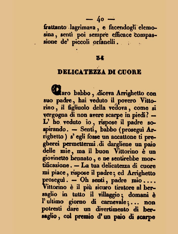 m aro babbo, «diceva Arri ghetto con suo padre, hai veduto il povero Vittorino, il figliuolo della vedova, come si vergogna di non avere scarpe in piedi? — L' ho veduto io, rispose il padre sospirando. — Senti,, babbo (proseguì Aiv righetto ) s'egli fosse un accattone ti pregherei permettermi «di dargliene un paio delle mie, ma il buon Vittorino è un giovinetto bennato , e ne sentirebbe mortificazione . — La tua delicatezza di cuore mi piace, rispose il padre ^ ed Arrighetto prosegui. — Oh senti, padre può.».. Vittorino è il più sicuro tiratore al bersaglio in tutto il villaggio: domani è P ultimo giorno di carnevale $... non potresti dare un divertimento di bersaglio , col premio dY un paio di scarpe