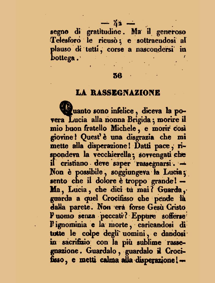 ^guanto sono infelice , diceva la povera Lucia alla nonna Brigida ; morire il mio buon fratello Michele, e morir cosi giovine ! Quest'è una disgrazia che mi mette alla disperazione! Datti pace, ri-