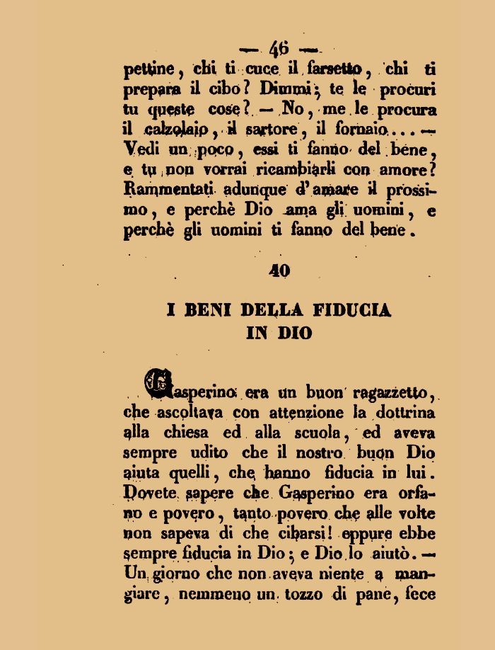 ^^asperino era un buon ragazzetto, che ascoìtafa con attenzione la dottrina ^lla chiesa ed alla scuola, ed aveva sempre udito che il nostro buon Dio 3Ìuta quelli, che, hanno fiducia in lui. Povete papere che G$sperino era orfano e povero, t^nto povero ch^ elle volte ijon sapeva di che cibarsi! eppure ebbe sempre fiducia in Dio} e Dio lo aiutò. — Un; giorno che non aveva niente 3 mangiare ? nemmeno un. tozzo di pane, fece