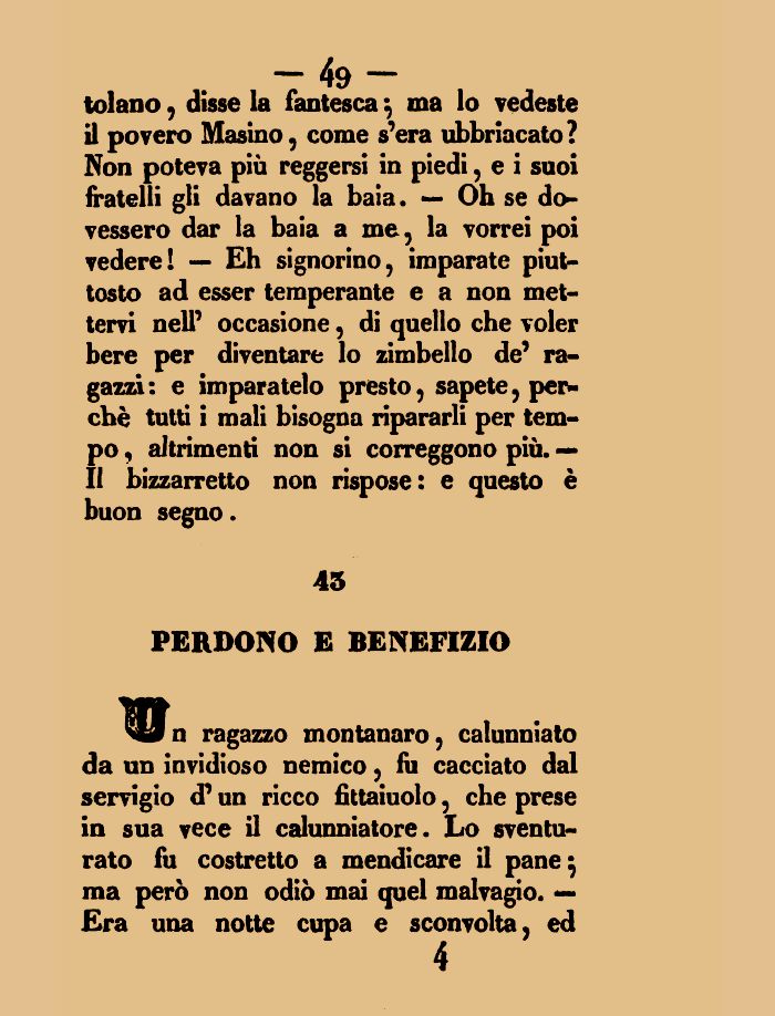 tolano , disse la fantesca ; ma lo vedeste il povero Masino, come s'era ubbriacato? Non poteva più reggersi in piedi, e i suoi fratelli gli davano la baia. — Oh se dovessero dar la baia a me, la vorrei poi vedere! — Eh signorino, imparate piuttosto ad esser temperante e a non mettervi nelP occasione, di quello che voler bere per diventare lo zimbello de' ragazzi: e imparatelo presto, sapete, per* che tutti i mali bisogna ripararli per tempo , altrimenti non si correggono più. — II bizzarretto non rispose: e questo è buon segno.
