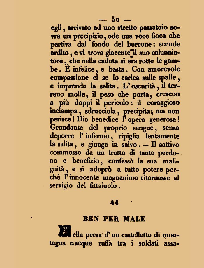 — 5o — egli, arrivato ad uno stretto passatoio sovra un precipizio, ode una voce fioca che partiva dal fondo del burrone: scende ardito, e vi trova giacente^ suo calunniatore , che nella caduta si era rotte le gambe . É infelice, e basta. Con amorevole compassione ei se lo carica sulle spalle, e imprende la salita. L'oscurità, il terreno molle, il peso che porta, crescon a più doppi il pericolo : il coraggioso inciampa, sdrucciola, precipita} ma non perisce ! Dio benedice P opera generosa ! Grondante del proprio sangue, senza deporre P infermo, ripiglia lentamente la salita, e giunge in salvo. — Il cattivo commosso da un tratto di tanto perdono e benefizio, confessò la sua malignità , e si adoprò a tutto potere perchè P innocente magnanimo ritornasse al servigio del fittaiuolo.