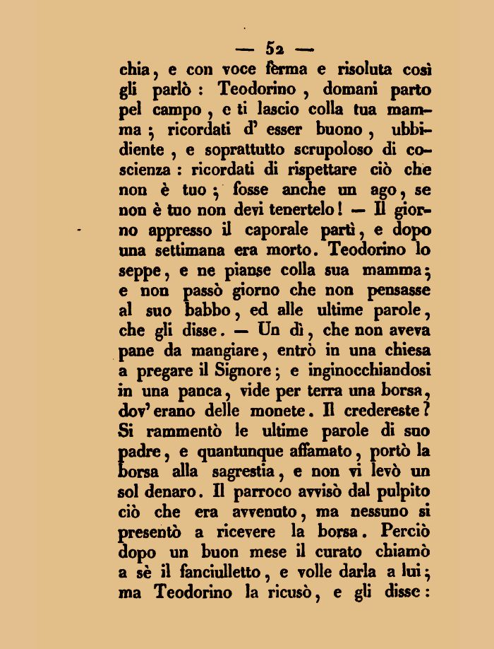 — 52 — chia, e con voce ferma e risoluta così gli parlò : Teodorino , domani parto pel campo , e ti lascio colla tua mamma ; ricordati d' esser buono , ubbidiente , e soprattutto scrupoloso di coscienza : ricordati di rispettare ciò che non è tuo ; fosse anche un ago, se non è tuo non devi tenertelo ! — Il gioi> no appresso il caporale partì, e dopo una settimana era morto. Teodorino lo seppe, e ne pianse colla sua mamma; e non passò giorno che non pensasse al suo babbo, ed alle ultime parole, che gli disse. — Un dì, che non aveva pane da mangiare, entrò in una chiesa a pregare il Signore ; e inginocchiandosi in una panca, vide per terra una borsa, dov'erano delle monete. Il credereste? Si rammentò le ultime parole di suo