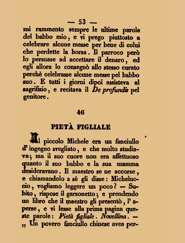 — 53 — mi rammento sempre le ultime parole del babbo mio5 e vi prego piuttosto a celebrare alcune messe per bene di colui che perdette la borsa. Il parroco però lo persuase ad accettare il denaro, ed egli allora lo consegnò allo stesso curato perchè celebrasse alcune messe pel babbo suo. E tutti i giorni dipoi assisteva al sagrifizio, e recitava il De profundis pel genitore.