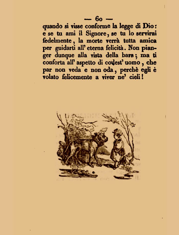 — 6o — quando si visse conforme la legge di Dio : e se tu ami il Signore, se tu lo servirai fedelmente, la morte verrà tutta amica per guidarti all' eterna felicità. Non pianger dunque alla vista della bara; ma ti conforta all' aspetto di cotjest' uomo, che par non veda e non oda, perchè egli è volato felicemente a viver ne' cieli!