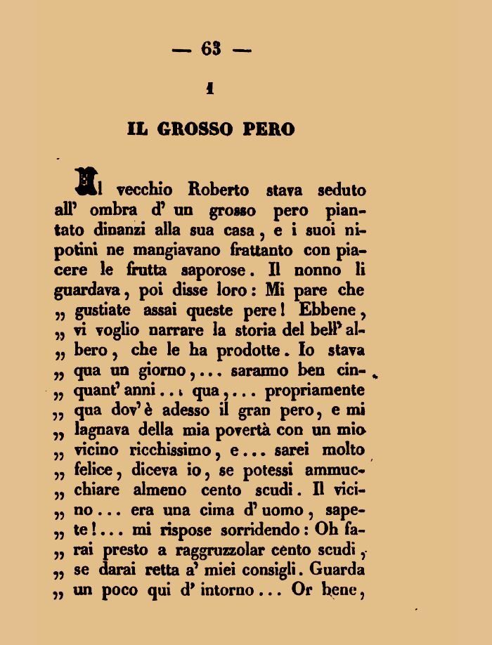 LI vecchio Roberto stava seduto all' ombra d' un grosso pero piantato dinanzi alla sua casa, e i suoi nipotini ne mangiavano frattanto con piacere le frutta saporose. Il nonno li guardava, poi disse loro : Mi pare che gustiate assai queste pere ! Ebbene, vi voglio narrare la storia del beli* al- bero, che le ha prodotte » Io stava qua un giorno,... saranno ben cin- , quant' anni.. i qua ,... propriamente qua dov'θ adesso il gran pero, e mi lagnava della mia povertΰ con un mio vicino ricchissimo, e.. sarei molto felice, diceva io, se potessi ammuc- chiare almeno cento scudi. Il vici- no ... era una cima d' uomo , sape-,, te ! .. mi rispose sorridendo : Oh fa- rai presto a raggruzzolar cento scudi, se darai retta a' miei consigli. Guarda un poco qui d* intorno... Or bene,