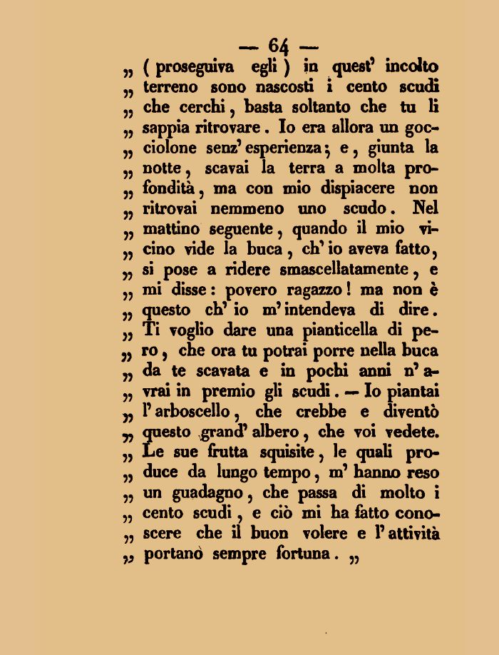 „ ( proseguiva egli ) in quest' incolto „ terreno sono nascosti i cento scudi „ che cerchi, basta soltanto che tu li „ sappia ritrovare • Io era allora un gocciolone senz' esperienza ; e , giunta la notte, scavai la terra a molta profondità, ma con mio dispiacere non ritrovai nemmeno uno scudo. Nel mattino seguente, quando il mio vicino vide la buca , eh1 io aveva fatto, si pose a ridere smascellatamele, e „ mi disse : povero ragazzo ! ma non è ,, questo eh' io m'intendeva di dire. „ Ti voglio dare una pianticella di pe-„ ro, che ora tu potrai porre nella buca „ da te scavata e in pochi anni n' a-„ vrai in premio gli scudi. — Io piantai „ Parboscello, che crebbe e diventò v questo grand1 albero, che voi vedete. ,, Le sue frutta squisite, le quali pro-,, duce da lungo tempo, m' hanno reso „ un guadagno, che passa di molto i „ cento scudi, e ciò mi ha fatto cono-„ scere che il buon volere e P attività portano sempre fortuna. „