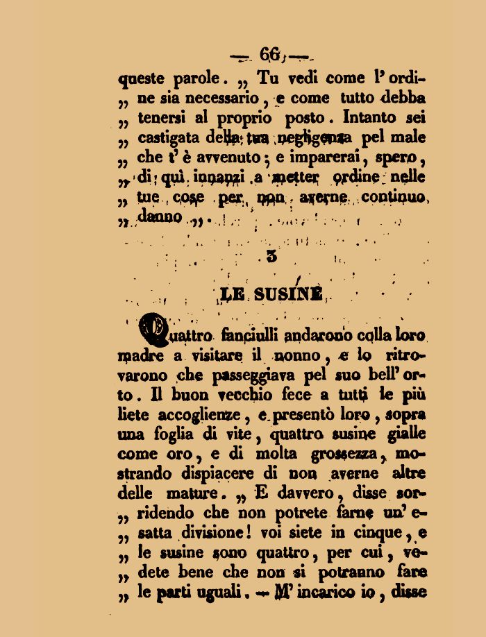 N^qattro fanciulli andarono colla loro ipadre a visitare il nonno, e lo ritrovarono che passeggiava pel suo bell'orto. Il buon vecchio fece a tutti le più liete accogliente, e presentò loro , sopra una foglia di vite, quattro susine gialle come oro, e di molta grossezza, mostrando dispiacere di non averne altre delle