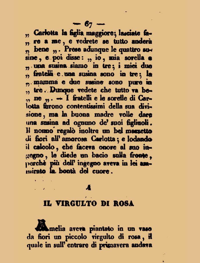 - «7 -„ Carlotta la figlia maggiore*, lacciaie &-„ re a ne, e vedrete se lutto anderà „ bene „. Prese adunque le quattro su* sine, e poi disse: ,, io, mia sorella e „ una susina siamo in tre^ i miei due „ fratelli e.una susina sono in tre-, la mamma e due susine sono pure in „ tré. Dunque vedete che tutto va be-„ ne „. I fratelli e le sorelle di Carlotta (trono contentissimi della sua divisione, ma la buona madre volle dare una susina ad ognuno de1 suoi figliuoli • 11 nonno' regalò inoltre un bel massetto di fiori all' amorosa Carlotta ; e lodando il calcolo, ehé faceva onore al suo indegno, le diede un bacio sulla fronte f perchè più dell' ingegno aveva in lei ammirato fa bontà del cuore.