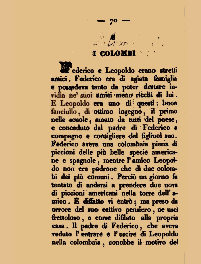 ^Federico e Leopoldo erano Stretti amici. Federico era di agiata famiglia e possedeva tanto da poter destare invidia ne' suoi amici meno ricchi di lui. E Leopoldo era uno di iresti: buon fanciullo, di ottimo ingegno, H primo nelle scuole, amato da tutti