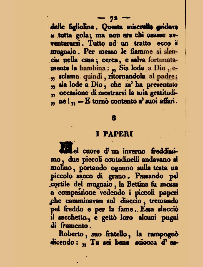 delle figjioline, Questa mise fletti gridava » tutta gola; ma 000 era chi osasse avventurarsi . Tutto ad un tratto ecco 'à mugnaio. Per mezzo le fiamme si slan-eia pella casa; cerca, e salva fortunatamente la bambina ; „ Sia lode a Dio , e-„ sclama quindi ? ritornandola al padre ; n sia lode a Dio, che m' ha presentato „ occasione di mostrarvi la mia gratitudì-„ ne ! „ — E tornò contento a1 suoi afiari.