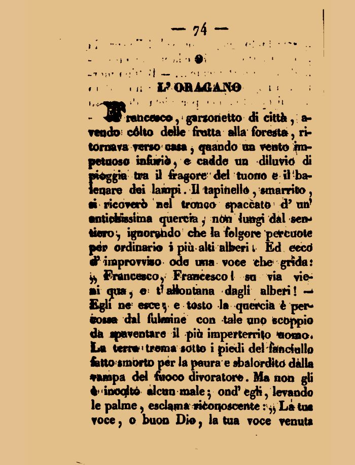 - 4m mticesco, gargonetto dì città , a-veodo còito delie fratta alla foresta, ritornava Terso casa, quando un vento ira-petaoso infuriò, e cadde un diluvio di piaggia tra il fragore del tuono eilba-leqare dei lampi. Il tapitielló, 'smarrivo, si ricoverò nel tronco spaccato d' un' antichissima quercia y n6n lungi dàl sentiero^ ignorando die la folgore percuote per ordinario i più alti alberi i Ed eecd tf improvviso ode una voce the grida! ^ Francesco, Francesco I su via vie* ni ^ua, « tf allontana dagli alberi! Egli ne esce', e tosto la quercia è percossa dal fiitarine con tale uno scoppio dà spaventare il più imperterrito noma, La terra-trema sotto i piedi del fafadullo tatto smorto per la paura e sbalordito dàlia *ampa del fuoco divoratore. Ma non gli è'inoqltó alcun maley ond'egK, levando le palme, esclama «Conoscente : ^ La tus voce, o buon Die, la tua voce venuta