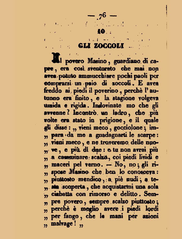 Si povero Masino , guardiano, di capre , era cosi sventurato che mai non area potuto ammucchiare pochi paoli per comprarsi un-paio di Boccoli . E ave* freddo ai, piedi il poverino, perche P autunno era finito, e la stagione volgeva umida e rigida. Indovinate mo che gli avvenne? Incontrò, un ladro, che più volte era stato in prigione, e il quale gli disse :,, vieni meco, gocciolone} im-„ para >da me a guadagnarti le scarpe : „ vieni meco, e ne trovereipo delle npo-n ve, e piii di d^e : e tu non avrai più „ a camminare scalzo , coipiedi lividi e „ maceri pel terno. — No, no} gli ri-„ spose Masino che ben lo conospeya : n piuttosto mendico, : a. pie nudi* te-yy tkk scoperta, che acquistarmi una sola ,, ciabatta con rimorso e delitto. Sem-„ pre povero, sempre scalzo piuttosto } „ perchè è meglio avere i piedi lordi „ per fango, che le mani per azioni „ malvage! „