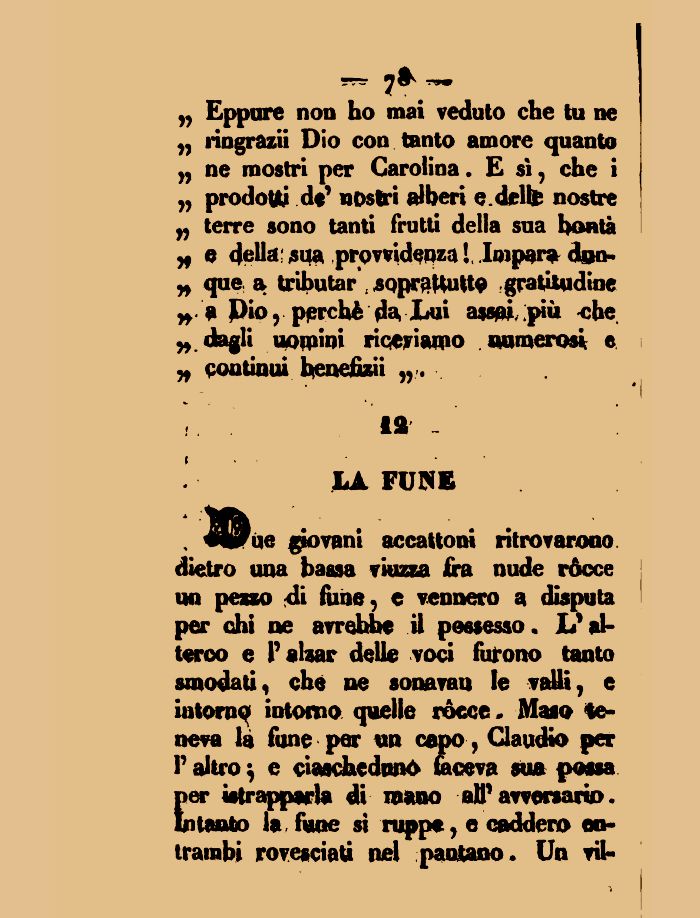 , ÌQfue giovani accattoni ritrovarono dietro una bassa viuzza fra nude ròcce un pezzo 4i (une, e vennero a disputa I per ohi ne avrebbe il possesso. Ualterco e r alzar delle voci furono tanto smodati, che ne sonavau le valli, e intorni intorno quelle rocce. Maao «teneva la fune per un capo, Gaudio per P altro $ e ciascheduni faceva w» possa