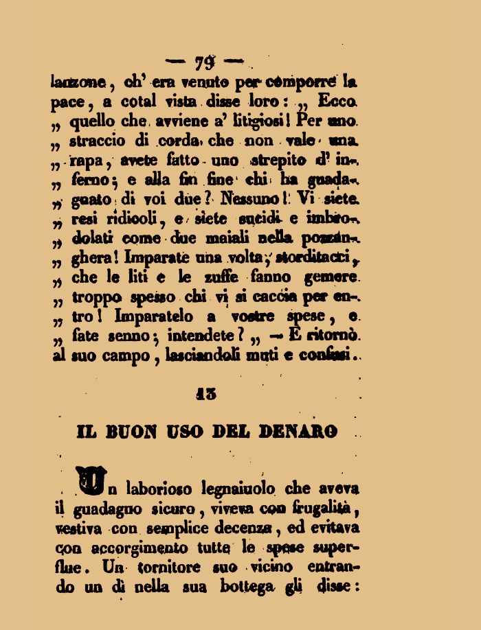— 7$ ~ lacfeone, oh' era venato per cèmporré la pace, a cotal vista disse loro: „ Ecco „ quello che, avviene a' litigiosi 1 Per uno. „ straccio di corda* che non vale < «na. „ rapa, avete fatto uno «strepito d- in»-, „ tèrno; e alla fin fine1 chi' ha guada*. n guato di voi due? Nessuno 1: Vi siete. „ resi rtdiooli, e siete aldeidi e imbto«% rt dolati come due maiali nella povàtn. „ ghera! Imparate una volta y stordita cri t ,, che le liti e le zuffe fanno gemere. „ troppo spesso chi vi si caccia per en~. „ tro ! Imparatelo a vostre spese, e. „ fate senno } intendete ? „ — È ritornò, al suo campo, lasciandoli muti e confini.
